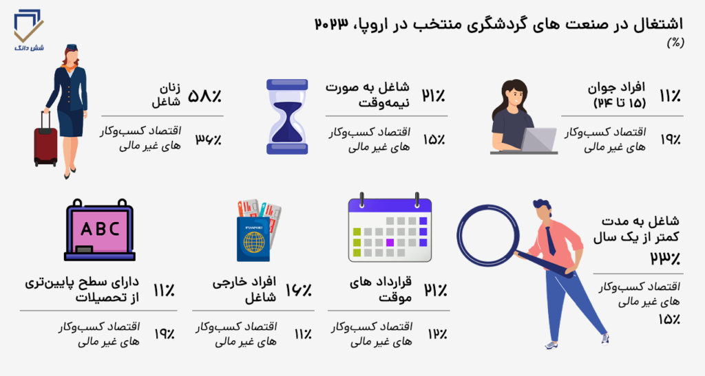 احتمال ایجاد قراردادهای کاری دوره ای در بخش گردشگری ۸.۸ درصد بیشتر از کل اقتصاد تجارت غیرمالی بود (۲۰.۸٪ در مقابل ۱۲.۰٪ افراد شاغل).