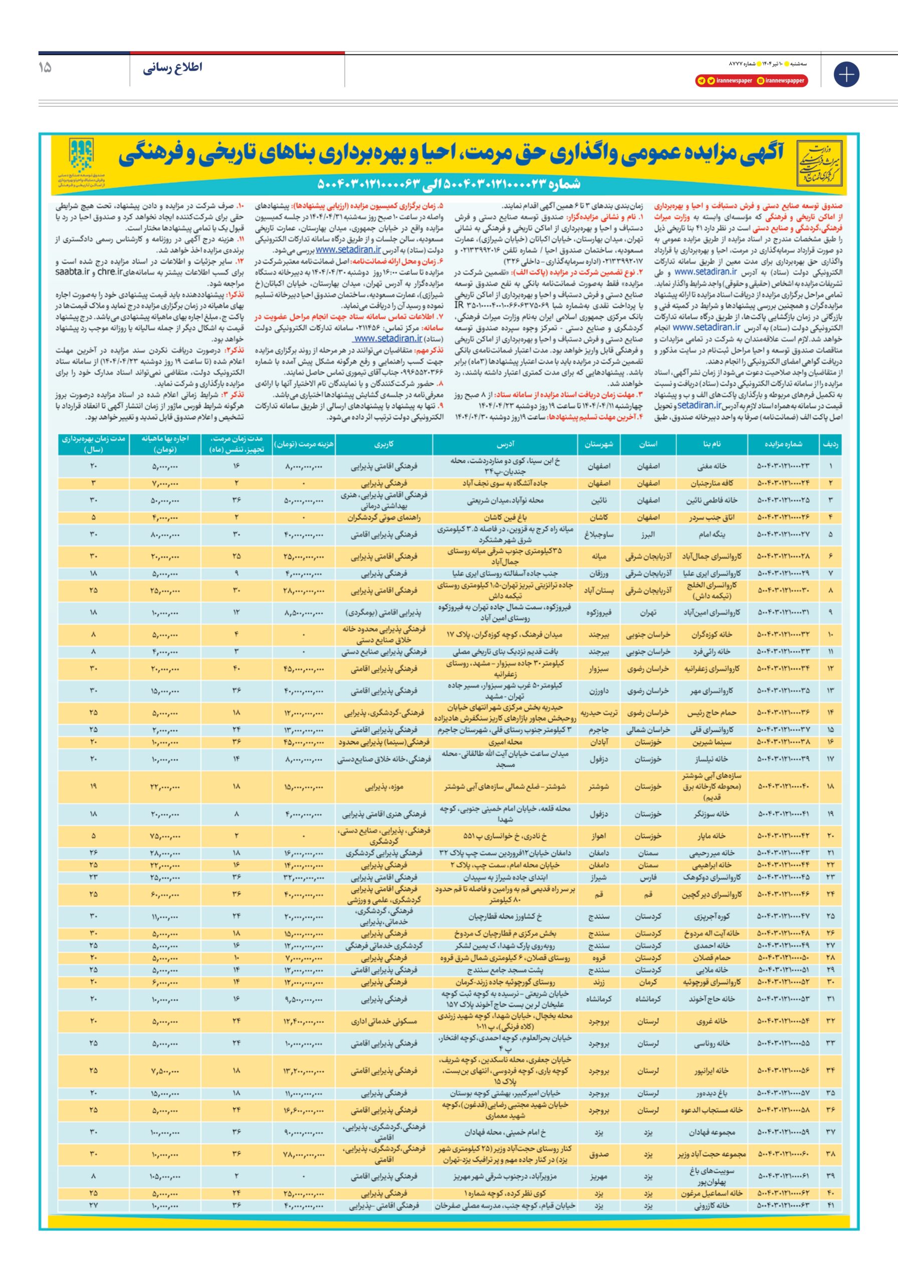 خانه میررحیمی و خانه ابراهیمی در دامغان استان سمنان، کاروانسرای دوکوهک در شیراز، کاروانسرای دیر گچین در استان قم، و کوره آجرپزی، خانه آیتالله مردوخ، خانه احمدی، حمام قصلان و خانه ملایی در استان کردستان نیز در فهرست این مزایده قرار دارند. در استان کرمان، کاروانسرای قورچوئیه در زرند معرفی شده و خانه حاج آخوند در کرمانشاه به مزایده گذاشته شده است.