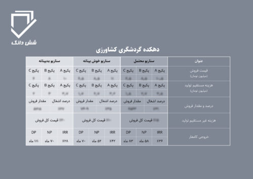 بررسی مالی و اقتصادی یک پروژه باید تابع شرایط مختلفی باشد اما بر اساس فرضیات مالی طراحی شده ۳ سناریو خوش بینانه،محتمل و بدبینانه برای سرمایه گذاری در دهکده گردشگری کشاورزی توسط دپارتمان مطالعات سرمایه گذاری شش دانگ طراحی و تدوین شده است تا سرمایه گذاران بسته به میزان ریسک پذیری و توان مالی بتوانند تحلیل درستی از این سرمایه گذاری داشته باشند