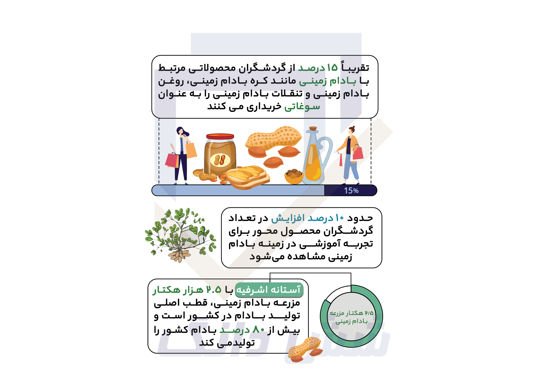 بر اساس مطالعات صورت گرفته توسط دپارتمان مطالعات سرمایه گذاری گردشگری شش دانگ،محصولات مرتبط به بادام زمینی همواره از سوغاتی های مدنظر گردشگران بوده است.برخی از اطلاعات استخراج شده ملی و جهانی گردشگری بادام توسط شش دانگ را در تصویر زیر مشاهده می نمایید.