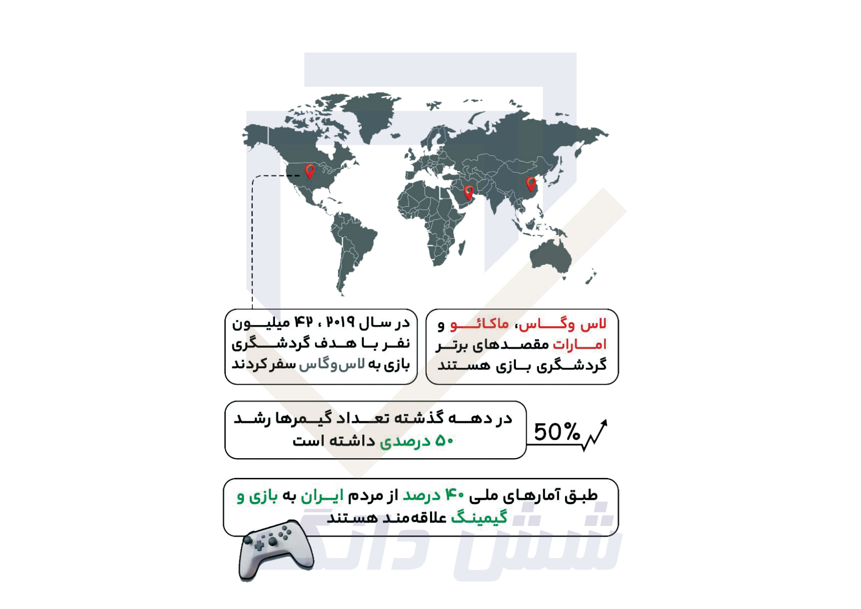 بر اساس مطالعات صورت گرفته توسط دپارتمان مطالعات سرمایه گذاری گردشگری شش دانگ،امارات از مقصدهای برتر گردشگری بازی در خاورمیانه می باشد.همچنین علاقه زیاد نسل جدید به بازی های الکترونیک،پتانسیل گردشگری بازی را بالا برده که می توان با استفاده از این موضوع،ایران را از بعد گردشگری بازی رشد داد.برخی از اطلاعات استخراج شده ملی و جهانی گردشگری بازی توسط شش دانگ را در تصویر زیر مشاهده می نمایید.