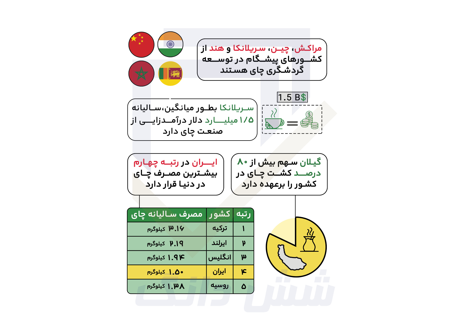 بر اساس مطالعات صورت گرفته توسط دپارتمان مطالعات سرمایه گذاری گردشگری شش دانگ،چای از محبوبترین نوشیدنی ها نزد ایرانی هاست.کشورهای با چای مرغوب مانند سریلانکا همواره در حال رونق گردشگری محصول محور چای هستند.برخی از اطلاعات استخراج شده ملی و جهانی گردشگری چای توسط شش دانگ را در تصویر زیر مشاهده می نمایید.