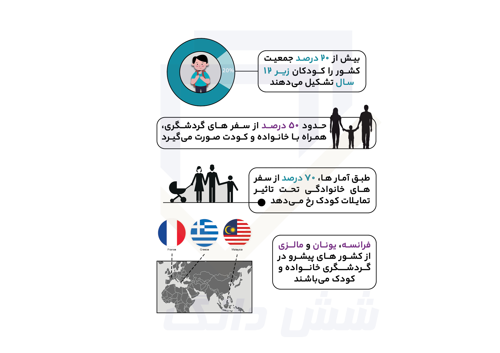بر اساس مطالعات صورت گرفته توسط دپارتمان مطالعات سرمایه گذاری گردشگری شش دانگ،کودکان نقش بسیار زیادی در انتخاب مقصد گردشگری دارند و همین عامل نشان می دهد که توجه به نیازهای کودکان از مهم ترین عوامل جذب گردشگران خانوادگی می باشد.برخی از اطلاعات استخراج شده ملی و جهانی گردشگری کودک توسط شش دانگ را در تصویر زیر مشاهده می نمایید.