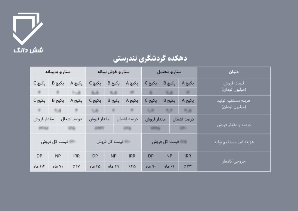 بررسی مالی و اقتصادی یک پروژه باید تابع شرایط مختلفی باشد اما بر اساس فرضیات مالی طراحی شده ۳ سناریو خوش بینانه،محتمل و بدبینانه برای سرمایه گذاری در دهکده گردشگری تندرستی توسط دپارتمان مطالعات سرمایه گذاری شش دانگ طراحی و تدوین شده است تا سرمایه گذاران بسته به میزان ریسک پذیری و توان مالی بتوانند تحلیل درستی از این سرمایه گذاری داشته باشند