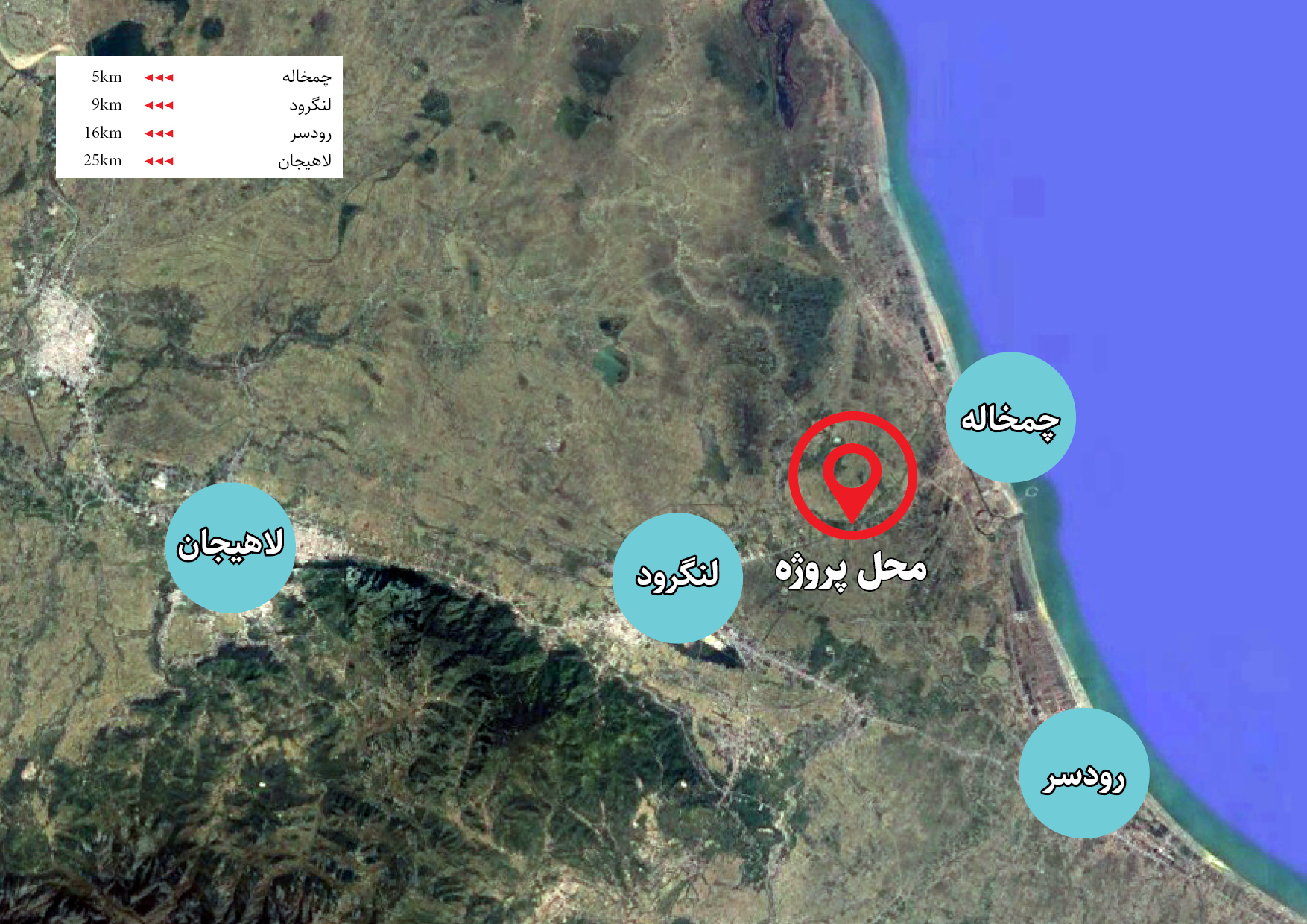 فاصله عرصه گردشگری چمخاله نسبت به شهرهای همجوار