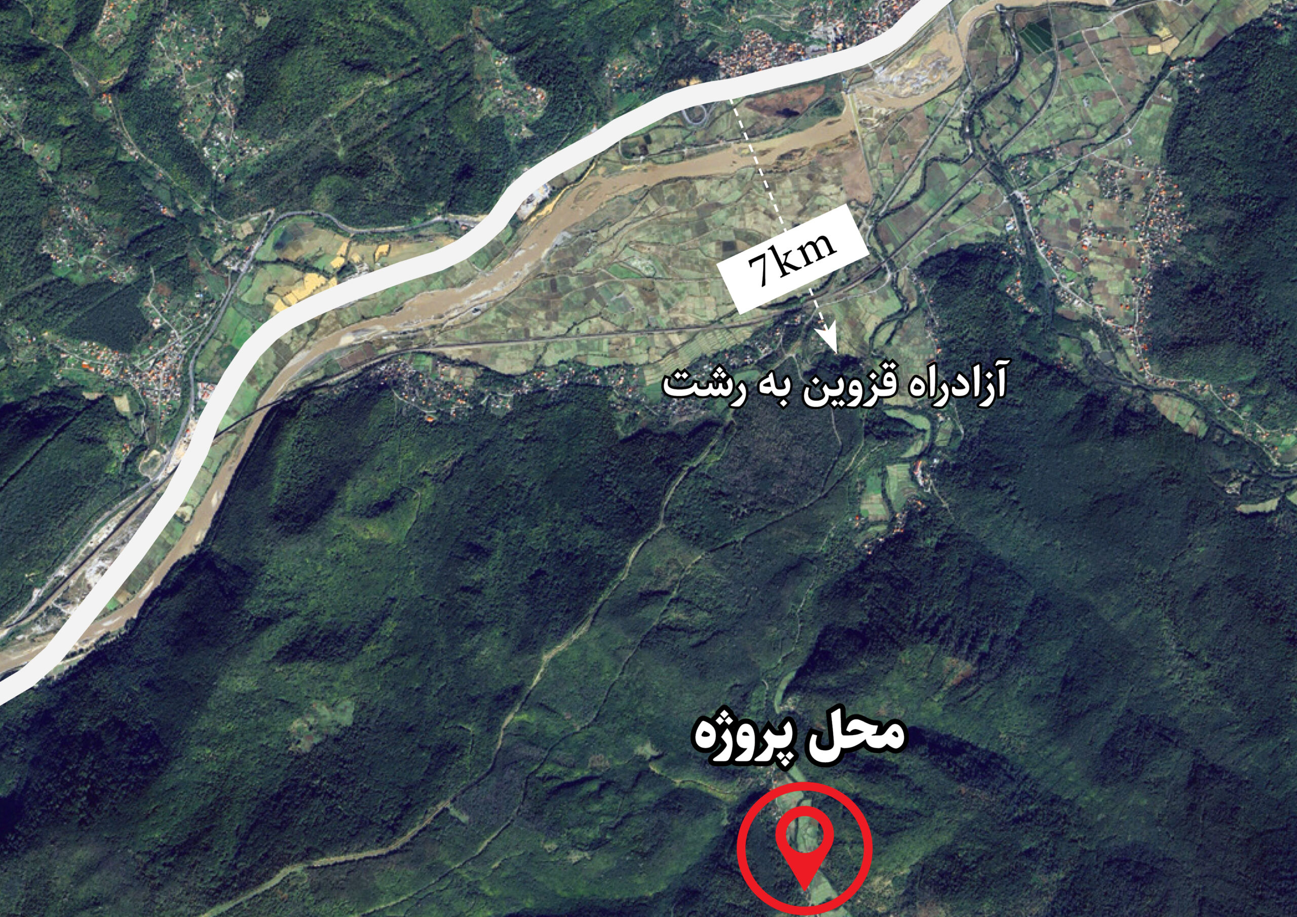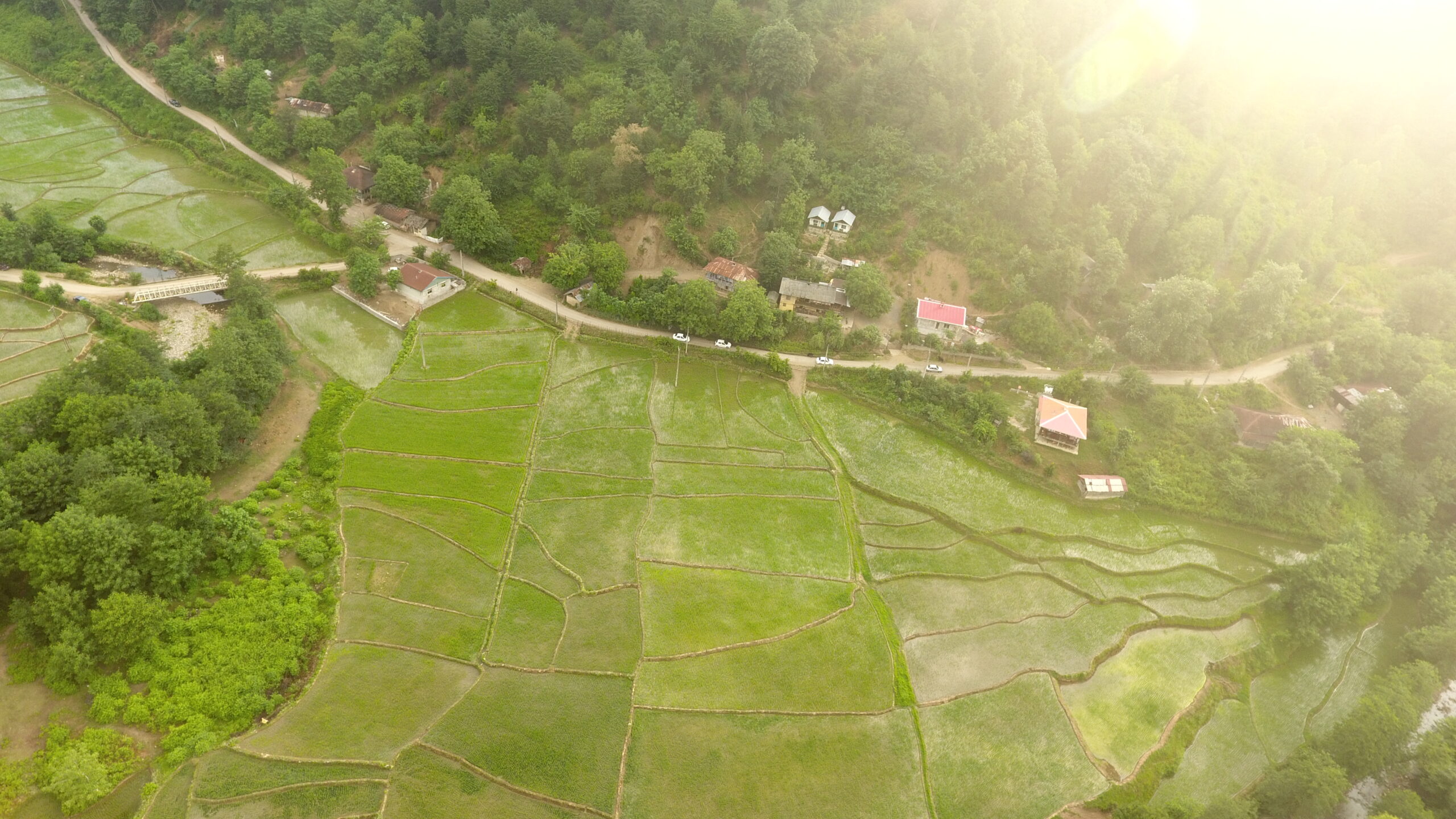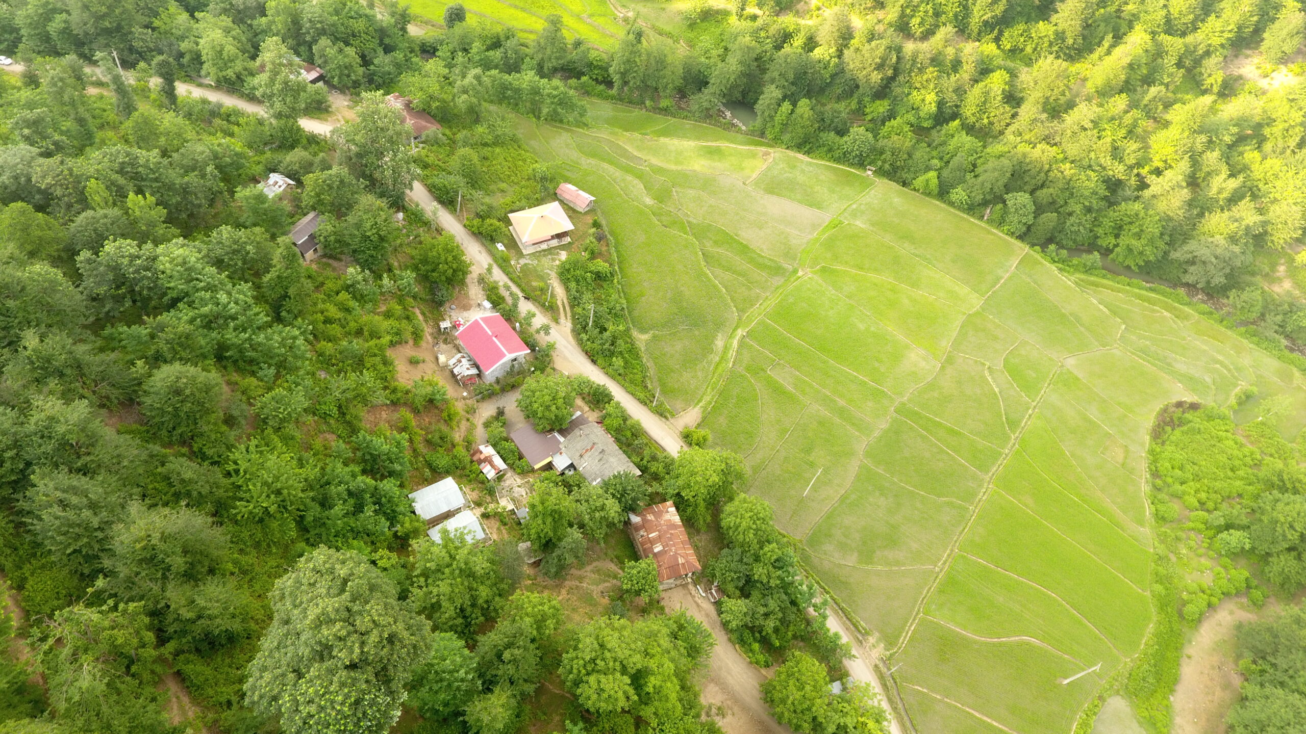 تصویر هوایی از اقامتگاه بومگردی رودبار با ویوی شالیزار و جنگل